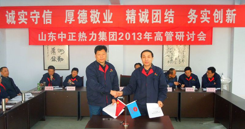 山東中正熱力集團2013年高管研討會于2013年3月29日上午8:00在集團總部三樓會議室召開,會期三天。會議由集團公司董事長李廣法主持,集團公司各部門、各權(quán)屬公司領(lǐng)導(dǎo)參加了會議。會議上,各單位、各部門匯報了2012年度工作報告和精細(xì)化管理實施方案;總經(jīng)理蔣俊卿作年度工作報告,公布兌現(xiàn)2013年度年薪,與各獨立核算單位和部門簽訂2014年度安全、經(jīng)營目標(biāo)責(zé)任書;討論通過了集團中長期規(guī)劃(2014-2023年度)及《全面推進集團精細(xì)化管理,為中正品牌和效益的提升而努力》、《集團資本運營管理實施意見》、《關(guān)于完善市場體系建設(shè)的實施意見》三個報告。
